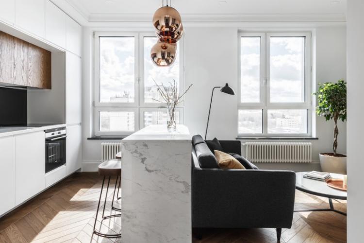 Классическая барная стойка изготавливается правильной формы с рабочей поверхностью, имитирующей натуральные материалы. Высокая конструкция может быть отдельно стоящим островом в гостиной или продолжением кухонного гарнитура. Ее используют для зонирования помещения.