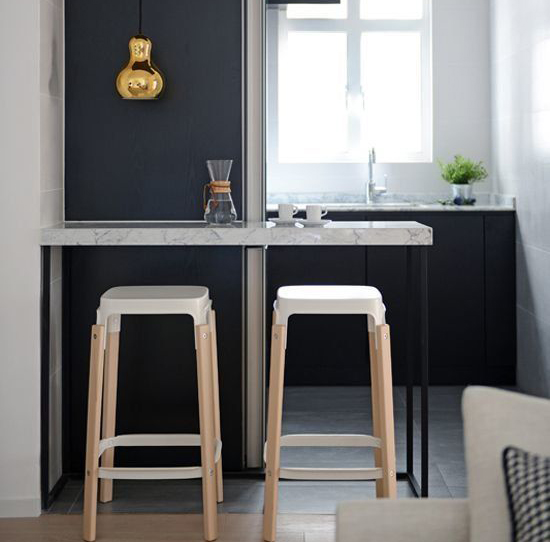 Короткая барная стойка из искусственного камня — оптимальное решение для небольших квартир. Она служит рабочей поверхностью и одновременно обеденным столом. Отсутствие пор в структуре материала не дает развиться плесени, грибку и бактериям на поверхности, делая конструкцию экологически безопасной.